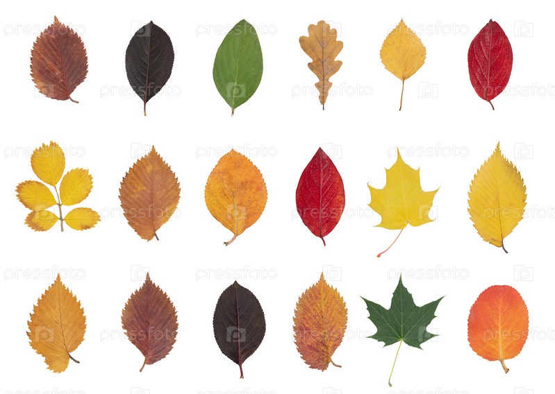 Набор разноцветных осенних листьев с разных деревьев и кустарников