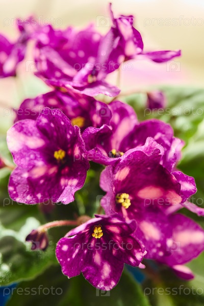 Цветущее комнатное растение Сенполия или африканская фиалка, крупные фиолетовые цветы с розовыми точками. Комнатное растение для домашнего декора. Крупный план, селективный фокус