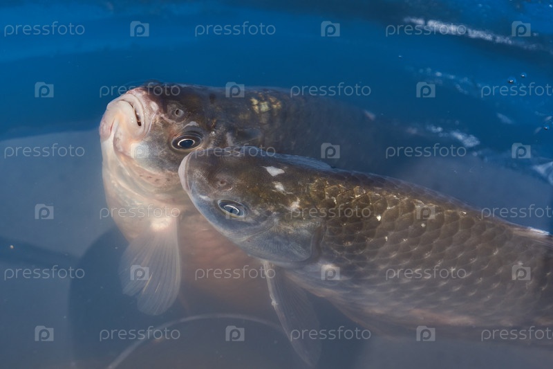 Караси плавают в искусственном пруду. Крупный план рыбы у поверхности воды - спокойное плавание под прозрачной гладью пруда