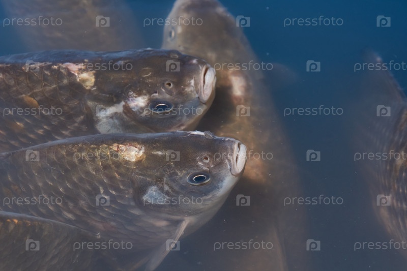 Караси плавают в искусственном пруду. Крупный план рыбы у поверхности воды - спокойное плавание под прозрачной гладью пруда