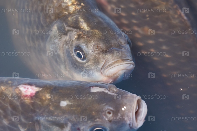 Караси плавают в искусственном пруду. Крупный план рыбы у поверхности воды - спокойное плавание под прозрачной гладью пруда