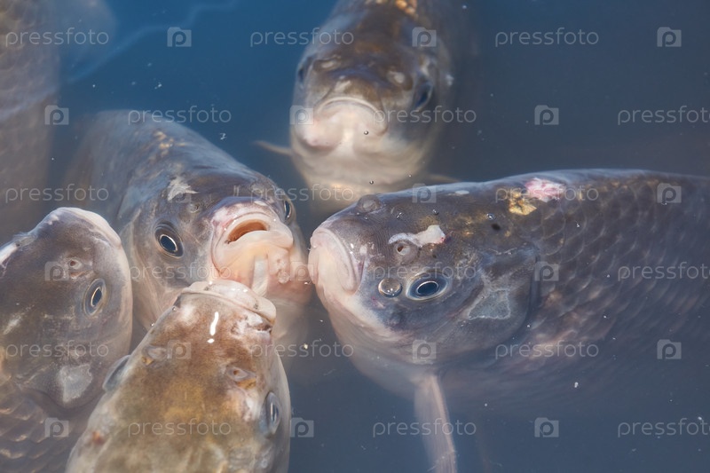 Караси плавают в искусственном пруду. Крупный план рыбы у поверхности воды - спокойное плавание под прозрачной гладью пруда