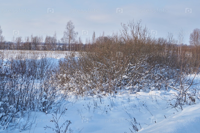 Снежный зимний пейзаж в пойме реки за городом. Сухая трава, кусты и деревья, покрытые снегом