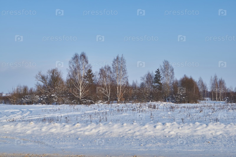 Снежный зимний пейзаж в пойме реки за городом. Сухая трава, кусты и деревья, покрытые снегом