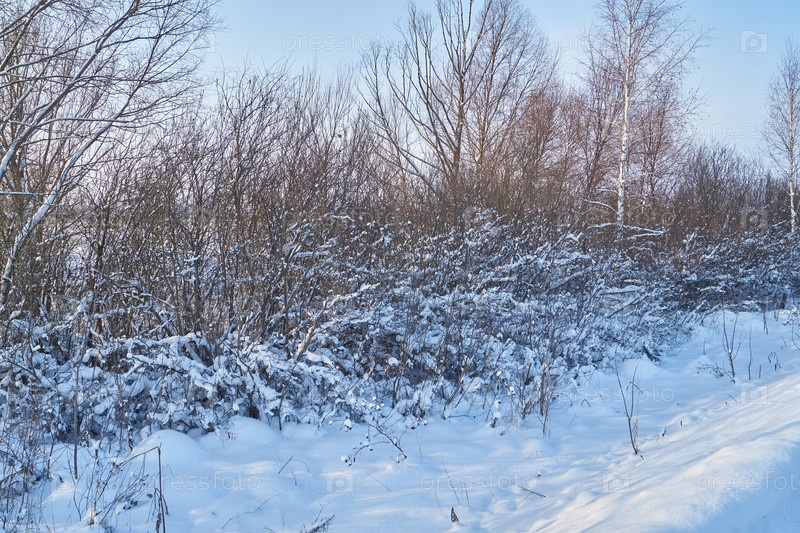 Снежный зимний пейзаж в пойме реки за городом. Сухая трава, кусты и деревья, покрытые снегом