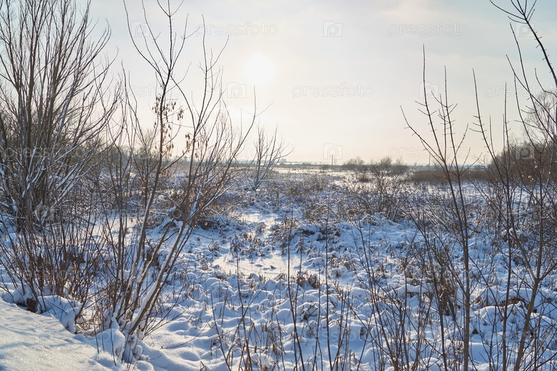 Снежный зимний пейзаж в пойме реки за городом. Сухая трава, кусты и деревья, покрытые снегом