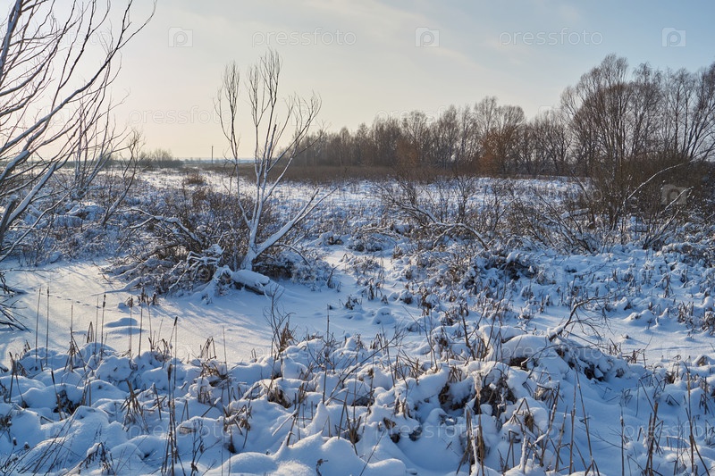 Снежный зимний пейзаж в пойме реки за городом. Сухая трава, кусты и деревья, покрытые снегом