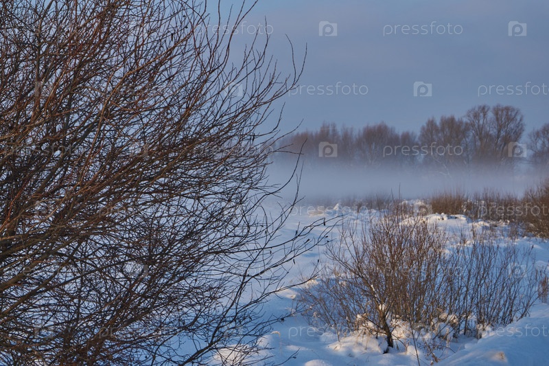 Снежный зимний пейзаж в пойме реки за городом. Сухая трава, кусты и деревья, покрытые снегом