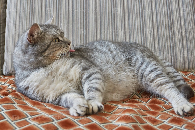 Кот пришел с улицы, греется и отдыхает на диване. Зима 2019