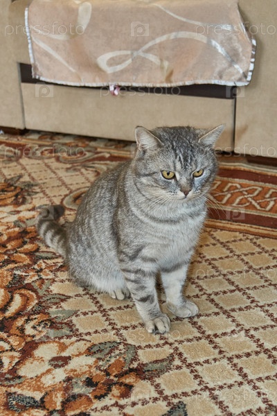 Кот пришел с улицы, греется и отдыхает на полу. Зима 2019 г