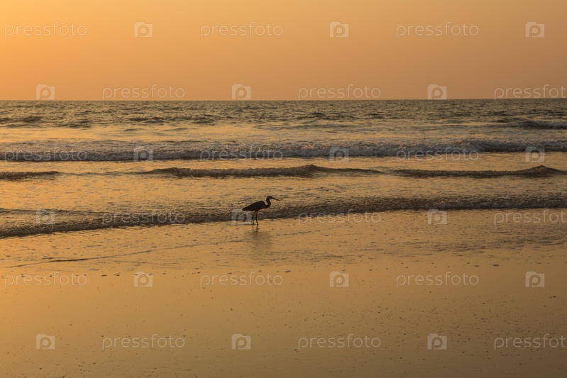 Цапля на закате собирает моллюсков на пляже