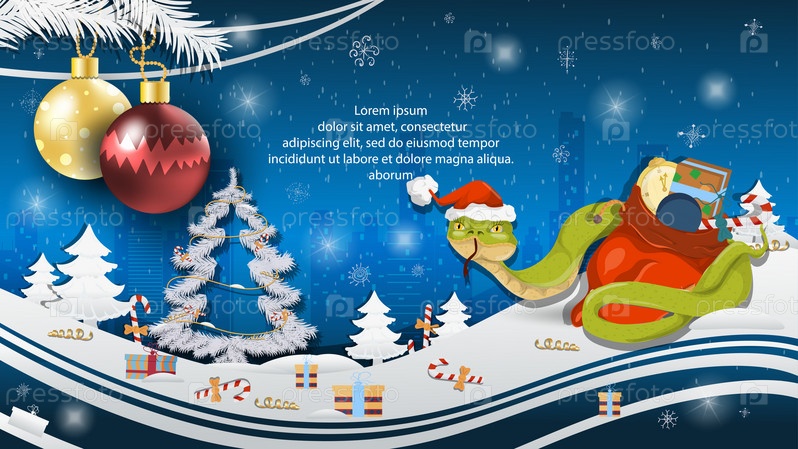 Иллюстрация к Рождеству и Новому году елочные шары на елке змея в шапке Санта-Клауса обвивает мешок с подарками