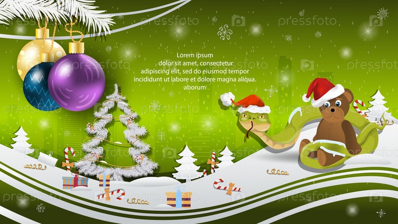 Рождественская и новогодняя иллюстрация елочные шары на елке змея в шапке Санта-Клауса обвивает игрушечного медведя