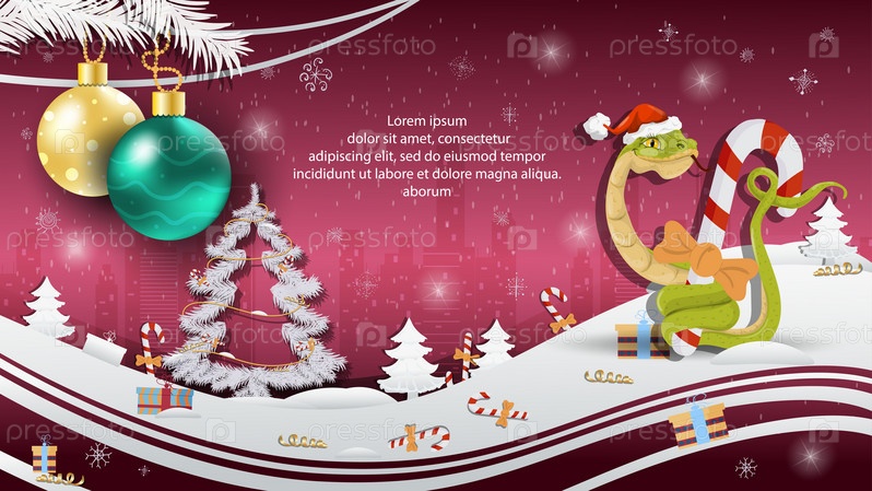 Рождественская и новогодняя иллюстрация елочные шары на елке змея в шапке Санта-Клауса обвивает конфету