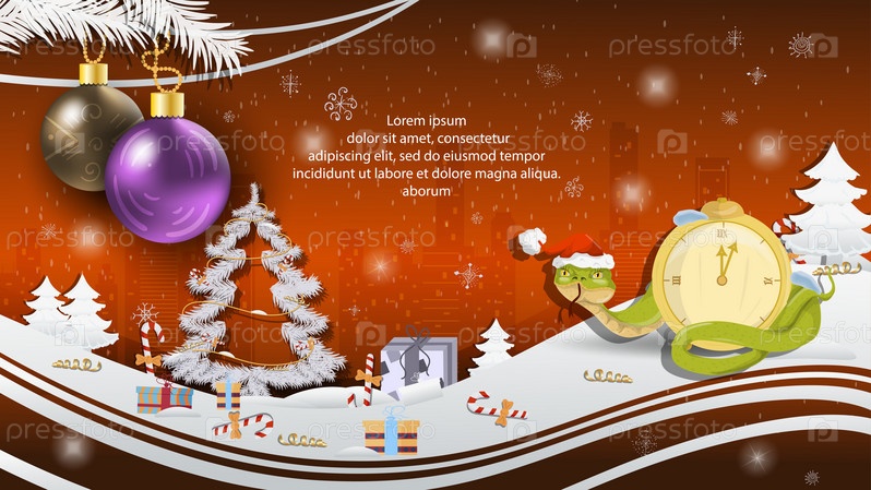 Иллюстрация Рождества и Нового года елочные шары на елке змея в шапке Санта-Клауса обвивает часы