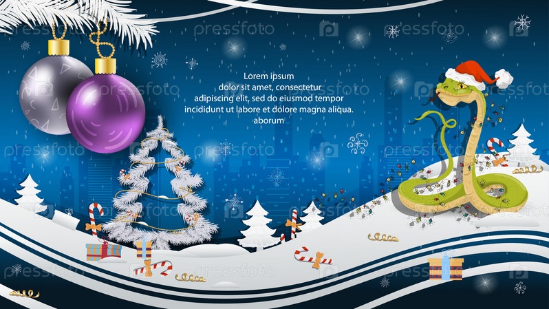 Рождественская и новогодняя иллюстрация елочные шары на елке змея в шапке Санта-Клауса, завернутая в гирлянду