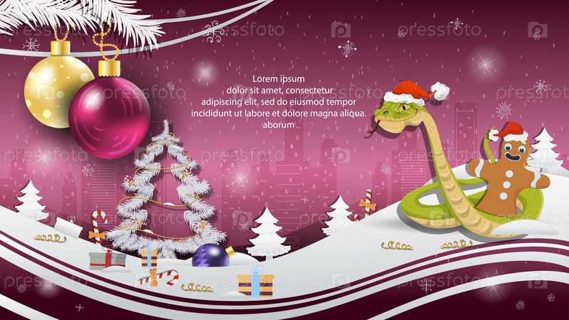 Рождественская и новогодняя иллюстрация с поздравительной открыткой Рождественские шары висят на ветках дерева Змея в шапке Санта-Клауса выползает из мешка с подарками