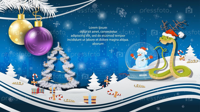 Рождественская и новогодняя иллюстрация с местом для заполнения текста поздравления елочные шары висят на ветках деревьев змея в шапке Санта-Клауса рядом со стеклянным шаром