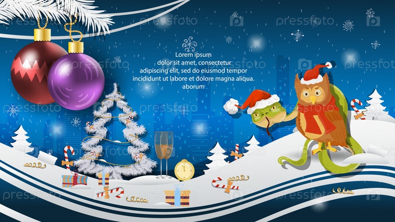 Рождественская и новогодняя иллюстрация елочные шары на елке змея и сова в шапке Санта-Клауса