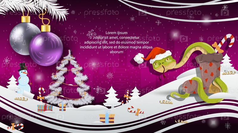 Рождественская и новогодняя иллюстрация елочные шары на елке змея в шапке Санта-Клауса выползает из носка за подарками