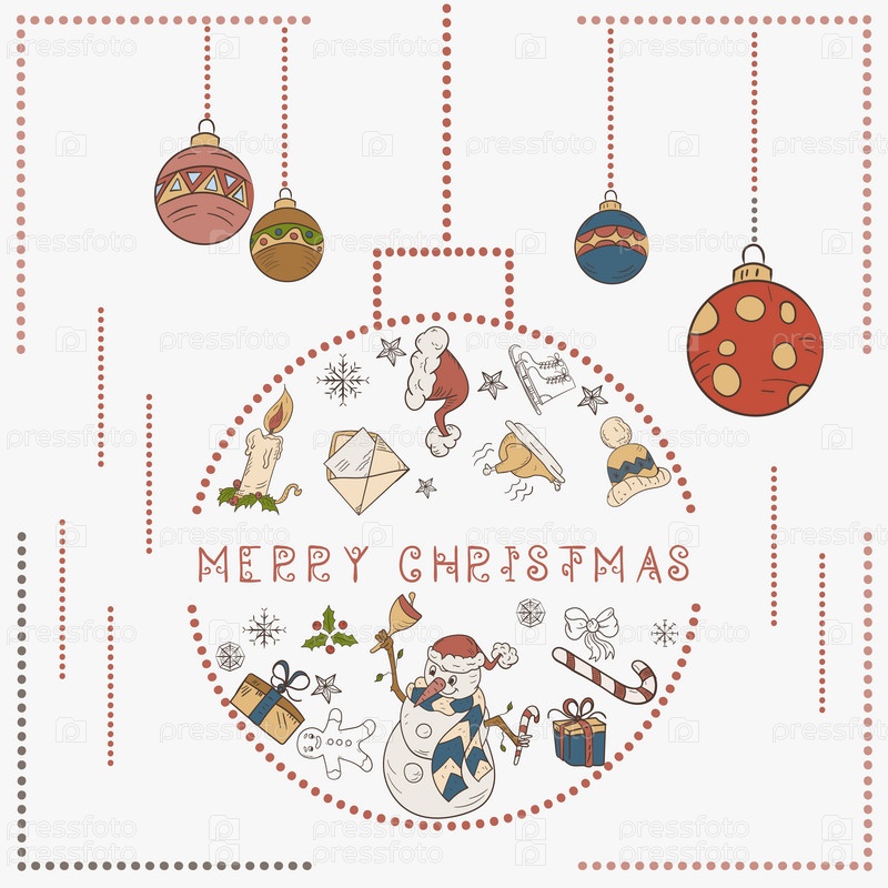 Рождественская цветная контурная иллюстрация в стиле детских рисунков Элементы рождественского дизайна в виде елочного шара Снеговик с колокольчиком