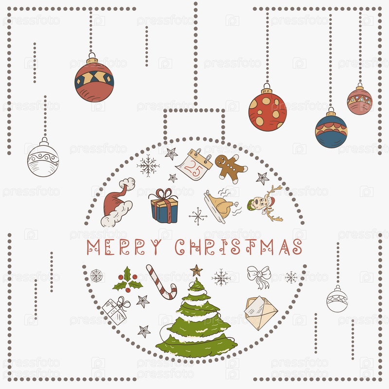Рождественская цветная контурная иллюстрация в стиле детских рисунков Рождественские элементы дизайна в виде елочного шара, праздничной елки