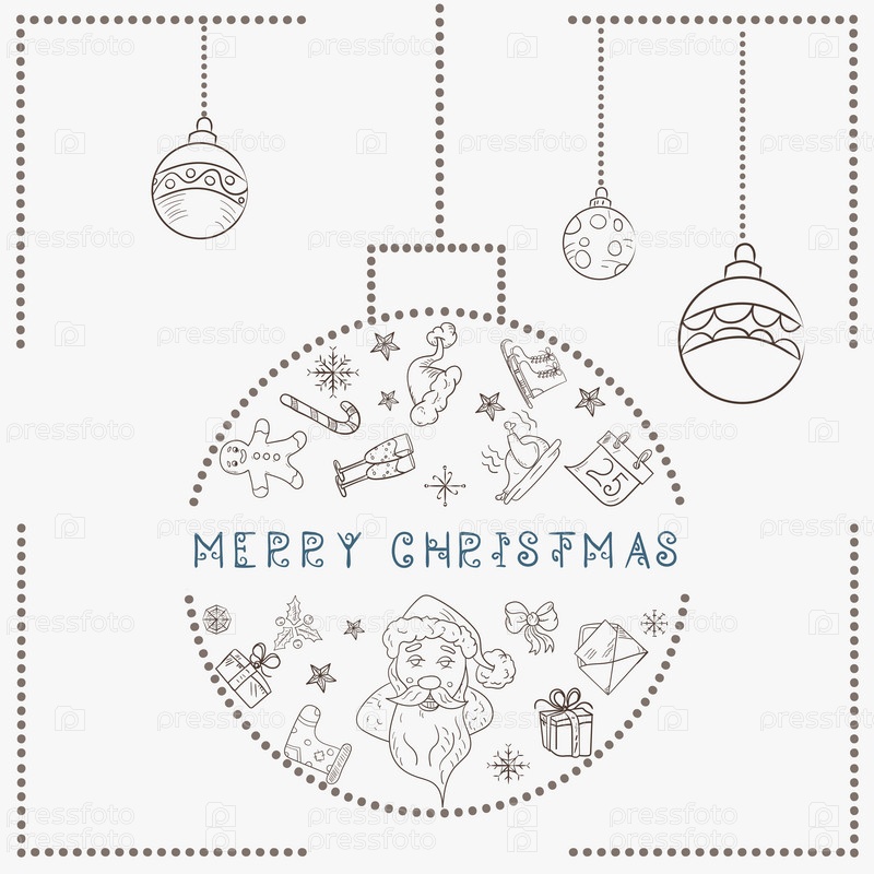 Рождественская контурная иллюстрация в стиле детских каракулей Элементы рождественского дизайна в рождественском шаре Голова Санта-Клауса