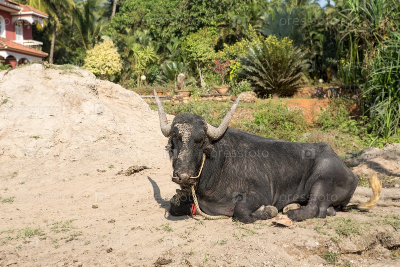 Большая черная корова лежит на земле