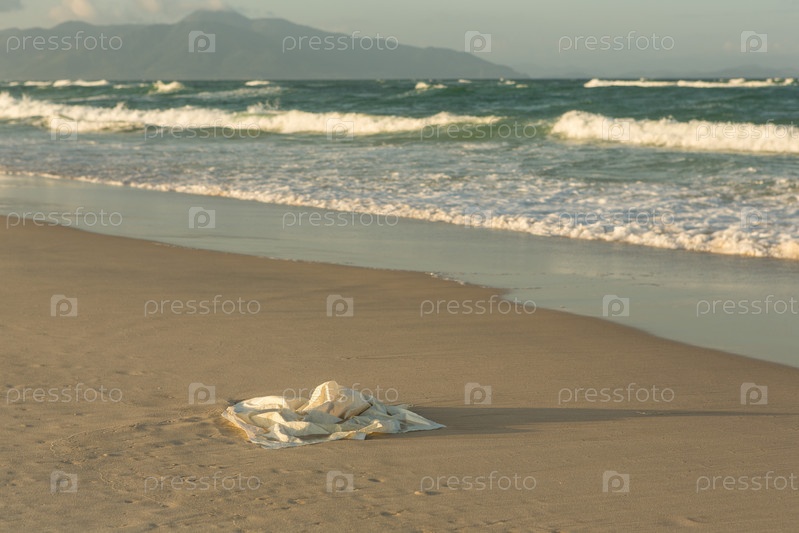 Пластиковый мусор на пляже в море, пластиковый пакет загрязняет море и природу
