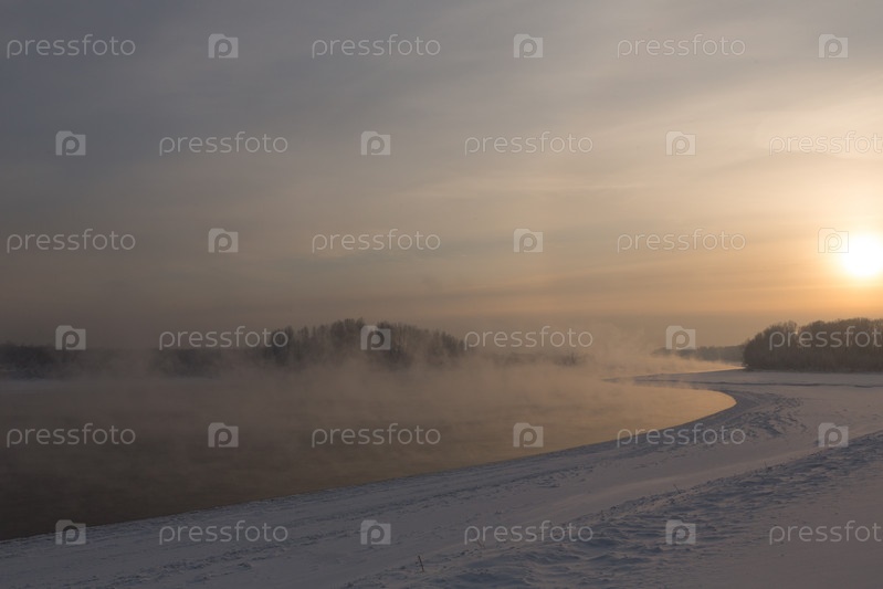 Зимний морозный закат на реке в Сибири зимой