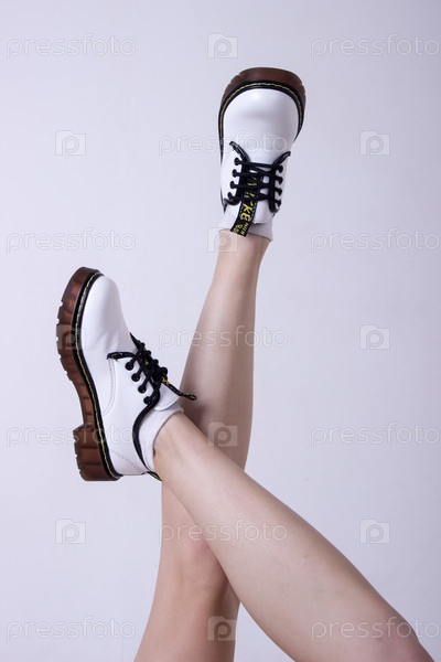 Женские кроссовки. Белые женские туфли на ногах. Кроссовки крупным планом