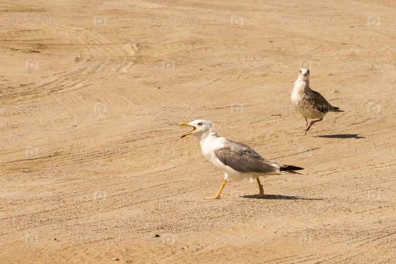 Большая чайка возле пляжа ищет еду