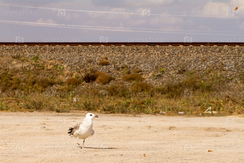 Большая чайка возле пляжа ищет еду
