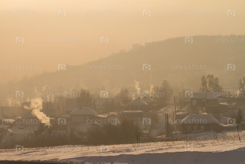 Зимний морозный закат на реке в Сибири зимой