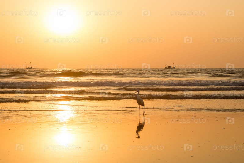 Цапля на закате собирает моллюсков на пляже