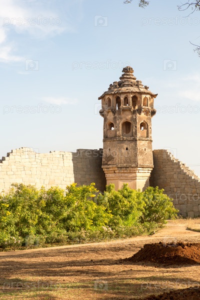 Туристическая индийская достопримечательность Древние руины в Хампи. Базар Хампи, Хампи, Карнатака, Индия