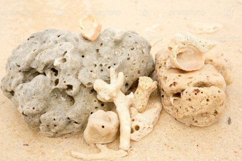 Кораллы и ракушки на песке
