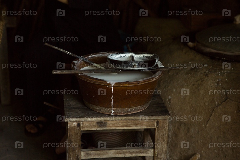Крупный план традиционной вьетнамской кастрюли со смесью для приготовления блинов из рисовой бумаги