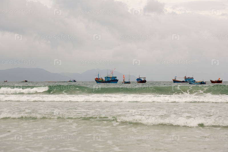 Корабли в море, небольшая волна в пасмурный день