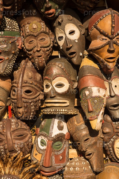 Традиционные африканские маски висят на прилавке на рынке