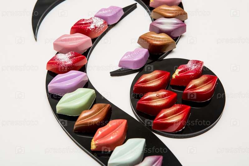 Вкусные шоколадные конфеты, крупный план, разные цвета