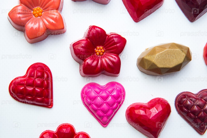 Вкусные шоколадные конфеты, крупный план, разные цвета