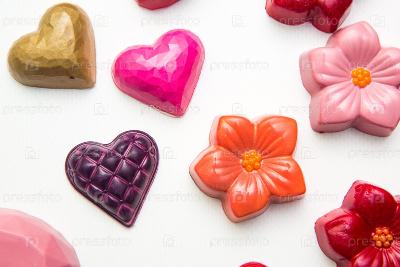 Вкусные шоколадные конфеты, крупный план, разные цвета