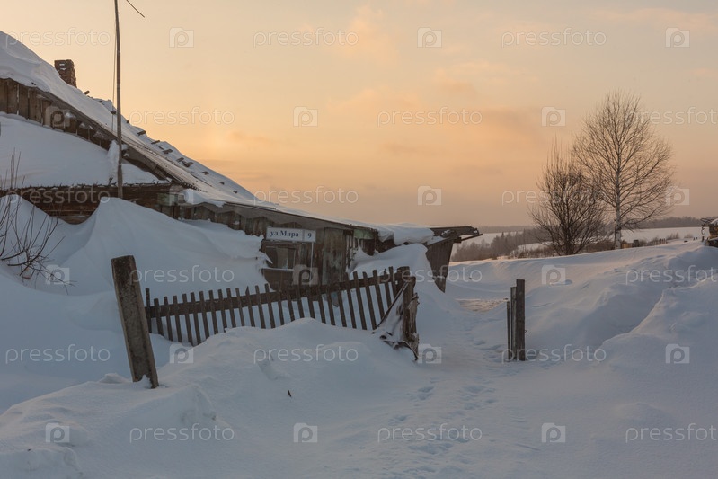 Старый деревянный дом в снежный зимний день