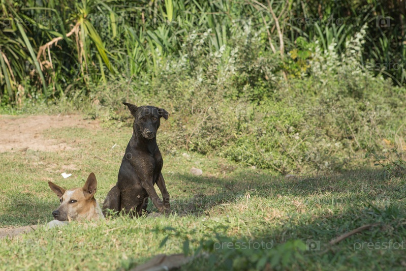 Бродячая собака на открытом воздухе наблюдает за людьми