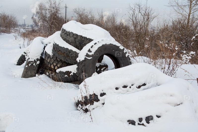 Старые выброшенные шины в снегу. загрязнение окружающей среды
