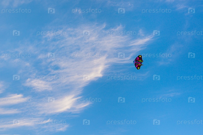Воздушный змей в синем небе с облаками. Хобби, активный отдых. Символ свободы