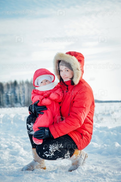 Мать и ребенок в теплой зимней одежде наслаждаются снежным пейзажем
