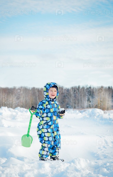 Счастливый ребенок держит снежок и лопату, наслаждаясь зимними играми на фоне заснеженного пейзажа