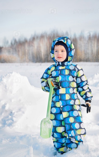 Маленький мальчик держит лопату и играет в снегу зимним днем